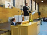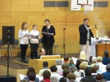 „Wo haben sie noch Kommunionhelfer gesucht?“ fragte eine Sängerin im Foyer. „Da drin, in der Kirche“, antwortet ihre Kollegin. Die Kirche war in diesem Fall ausgestattet mit Basketball-Körben, Sitztribünen und bunten Linien auf dem Boden: Es musste schon eine Sporthalle sein, um allen Kirchenchören im katholischen Dekanat Bruchsal auf einmal Platz zu bieten, die „regulären“ Gottesdienstbesucher bekamen sogar Tribünenplätze. Ging es beim letzten Chortag noch nach Speyer, hatte man sich jetzt für heimische Gefilde entschieden: Zuvor gestalteten die Chöre gruppenweise in den sechs Bruchsaler Kirchen so genannte Statio-Gottesdienste, kurze Andachten in verschiedener musikalischer Ausrichtung. „Ich war beeindruckt von der Vielfalt des Chorgesangs“, lobte Dekan Wolfram Stockinger, der zumindest an drei Veranstaltungen einige Minuten verbracht hatte, bevor die kurze Sternwallfahrt in die Sporthalle einsetzte.
