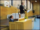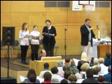 Rund 1000 Stimmen beim Dekanats-Chortag in Bruchsal „Wo haben sie noch Kommunionhelfer gesucht?“ fragte eine Sängerin im Foyer. „Da drin, in der Kirche“, antwortet ihre Kollegin. Die Kirche war in diesem Fall ausgestattet mit Basketball-Körben, Sitztribünen und bunten Linien auf dem Boden: Es musste schon eine Sporthalle sein, um allen Kirchenchören im katholischen Dekanat Bruchsal auf einmal Platz zu bieten, die „regulären“ Gottesdienstbesucher bekamen sogar Tribünenplätze. Ging es beim letzten Chortag noch nach Speyer, hatte man sich jetzt für heimische Gefilde entschieden: Zuvor gestalteten die Chöre gruppenweise in den sechs Bruchsaler Kirchen so genannte Statio-Gottesdienste, kurze Andachten in verschiedener musikalischer Ausrichtung. „Ich war beeindruckt von der Vielfalt des Chorgesangs“, lobte Dekan Wolfram Stockinger, der zumindest an drei Veranstaltungen einige Minuten verbracht hatte, bevor die kurze Sternwallfahrt in die Sporthalle einsetzte.