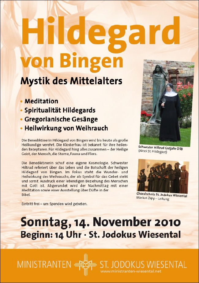 Die Benediktinerin Hildegard von Bingen wird bis heute als große Heilkundige verehrt. Die Klosterfrau ist bekannt für ihre heilenden Rezepturen. Für Hildegard hing alles zusammen – der Heilige Geist, der Mensch, die Sterne, Fauna und Flora. Die Benediktinerin schuf eine eigene Kosmologie. Schwester Hiltrud referiert über das Leben und die Botschaft der heiligen Hildegard von Bingen. Im Fokus steht die Wunder- und Heilwirkung des Weihrauchs, der als Symbol für das Gebet steht und somit Ausdruck einer lebendigen Beziehung des Menschen mit Gott ist. Abgerundet wird der Nachmittag mit einer Meditation sowie einer Ausstellung über Düfte in der Bibel.